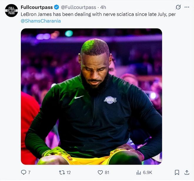 北京时间10月11日,根据Shams的报道,勒布朗-詹姆斯的坐骨神经痛最初发生在7月的一次训练中截至目前他已经持续与之对抗并管理这一伤病长达两个半月。