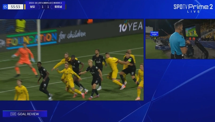 比赛第54分钟,约翰逊本坦库尔闪电扳平,VAR介入判罚犯规在先,进球无效。博德闪耀仍然1-0领先热刺!