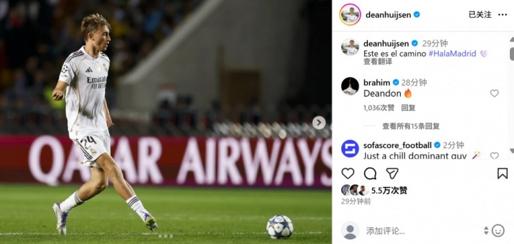 本场比赛皇马后卫赫伊森首发,赛后他也在社媒晒照庆祝胜利,写道:“就是以这样的方式获胜,皇马加油!”