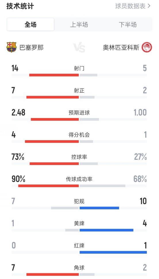 巴萨6-1奥林匹亚科斯数据:射门14-5,射正7-2,控球率73%-27%